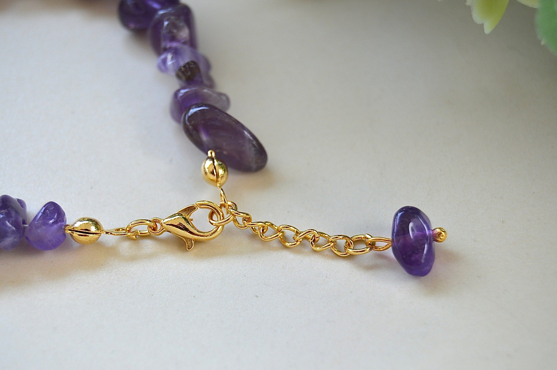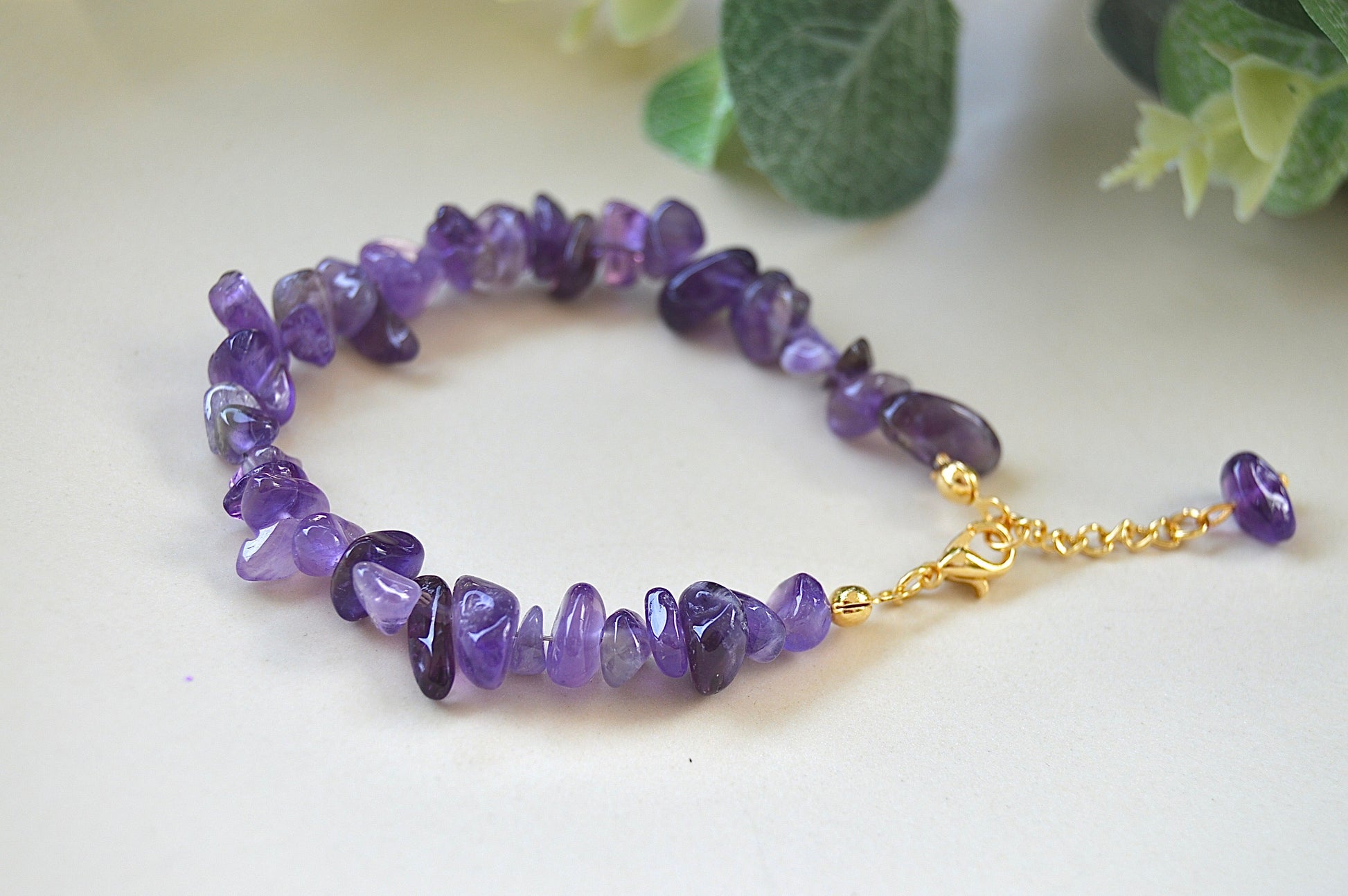 Et elegant og håndlaget armbånd laget av naturlige ametyst-steiner i chipsform, kombinert med delikate gullbelagte detaljer. De uregelmessige steinene gir et unikt og levende uttrykk – perfekt for deg som ønsker et smykke med karakter og dyp symbolikk.