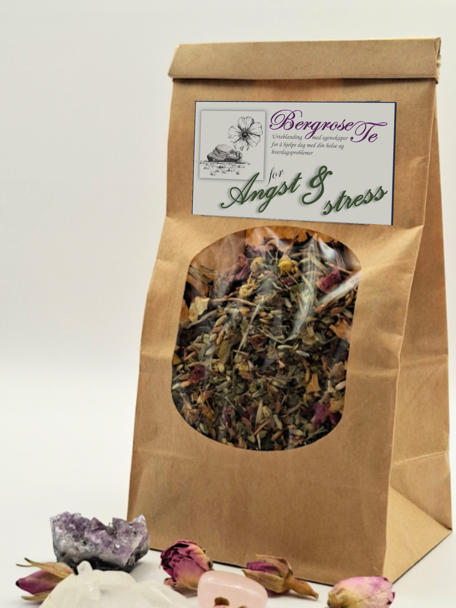 Urteblanding med pasjonsblomst, rødkløver, løvetannblad, brennesle, lavendel, kamille og rose.