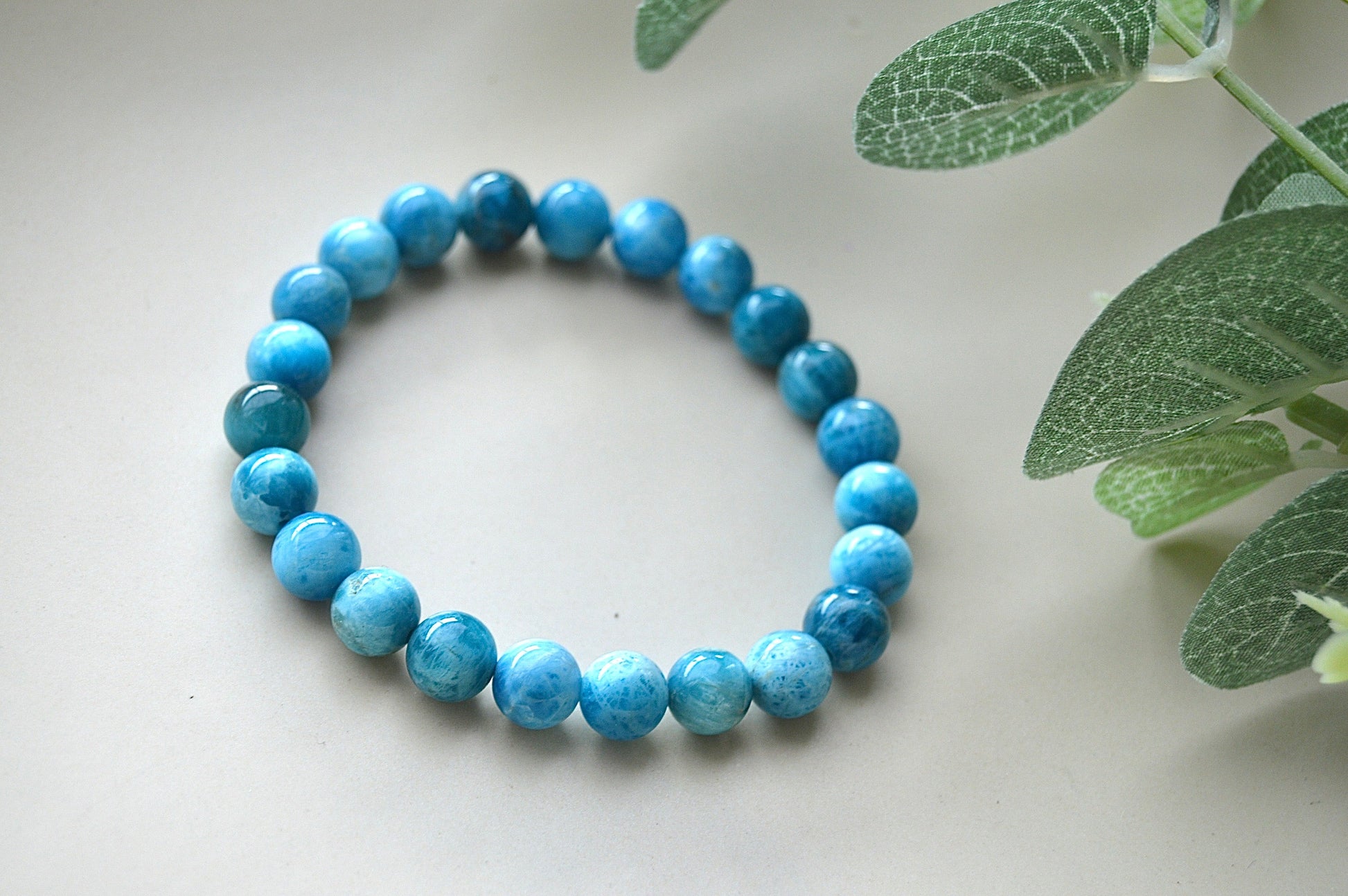 Et vakkert armbånd laget av ekte apatittperler med en størrelse på ca. 8 mm. Armbåndet har elastisk tråd som gir en komfortabel passform til håndledd på ca. 18–20 cm.