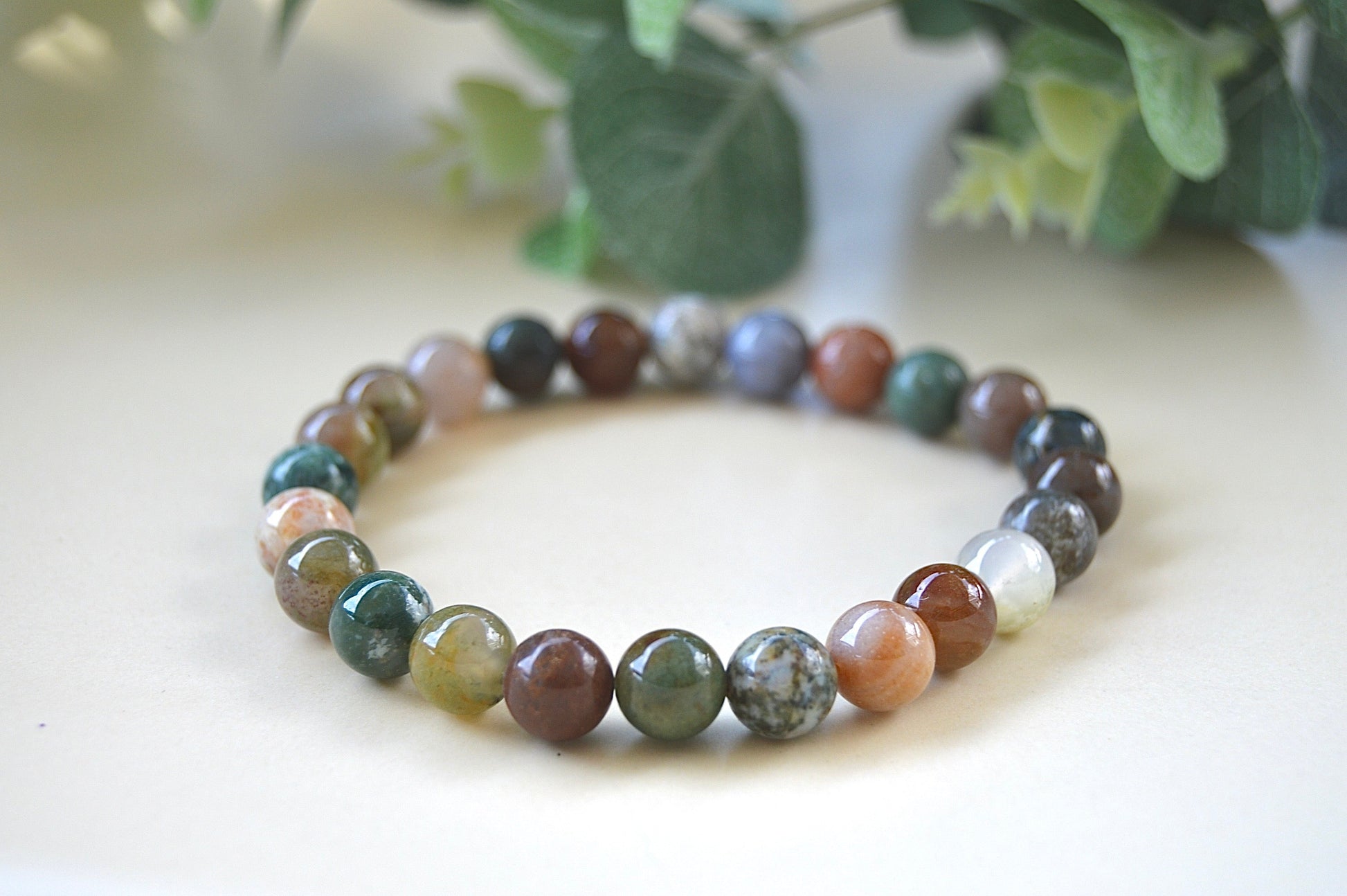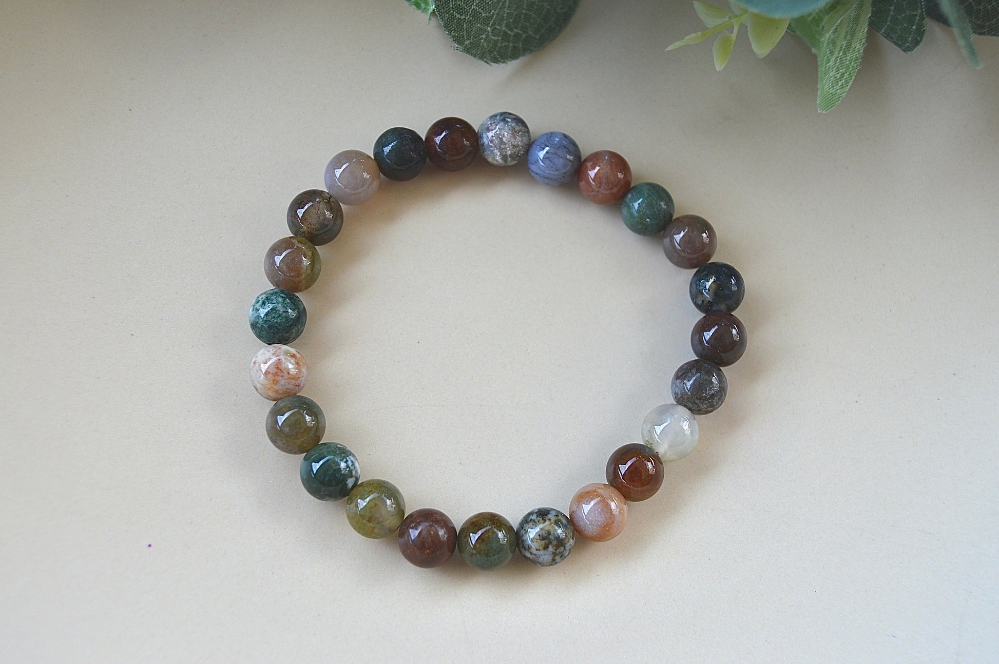 Et vakkert armbånd laget av naturlig indisk agat, kjent for sine jordnære nyanser og beroligende energi. Steinene har en størrelse på ca. 8 mm, og armbåndet har elastisk strikk som passer håndledd mellom ca. 18–20 cm.