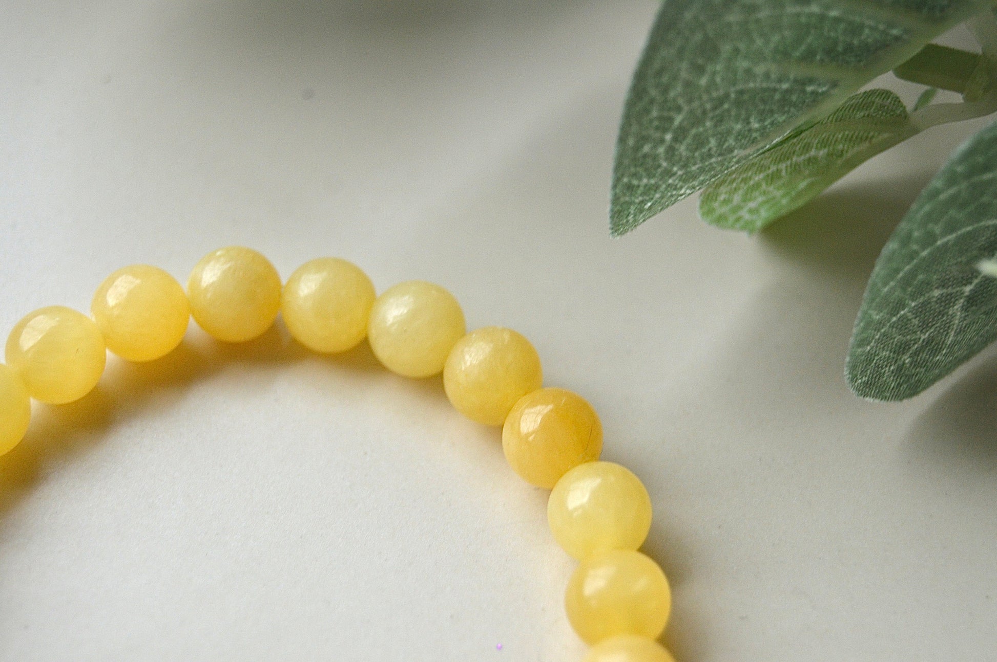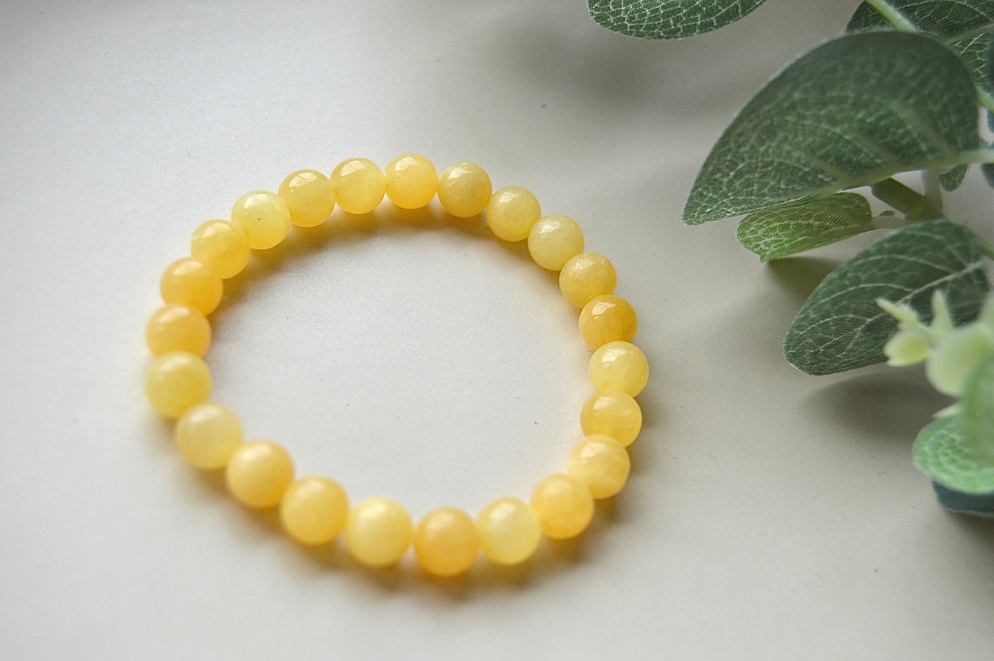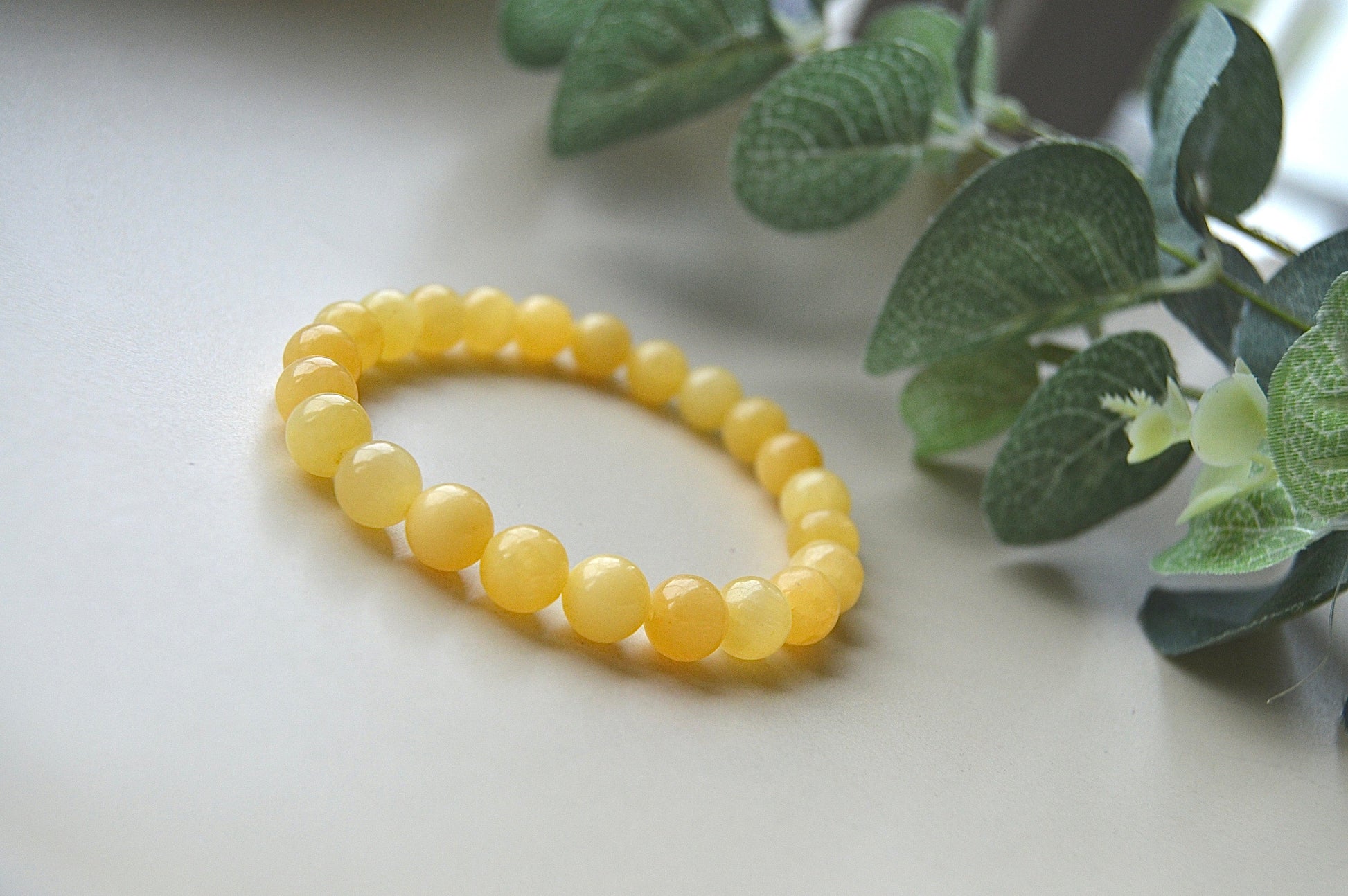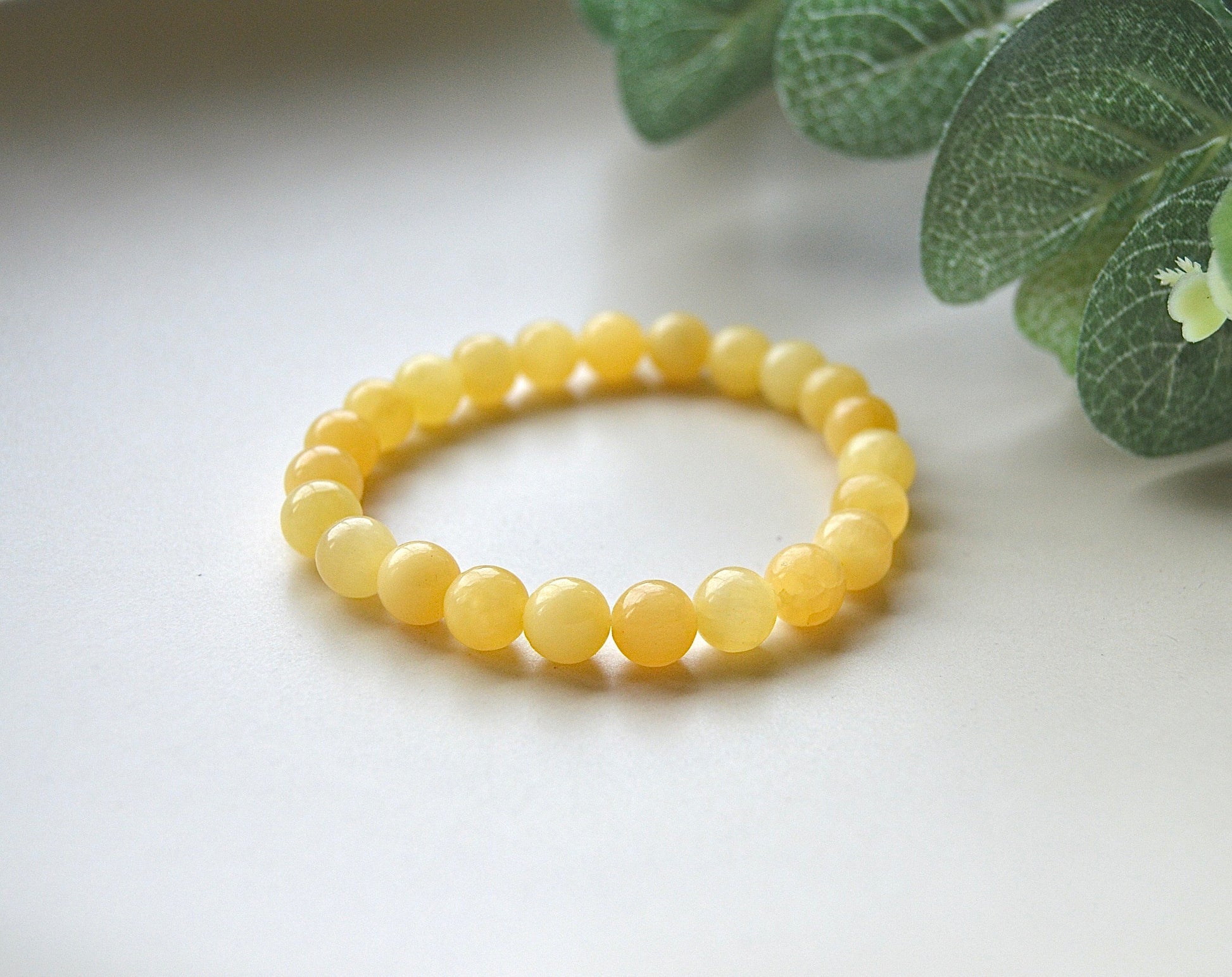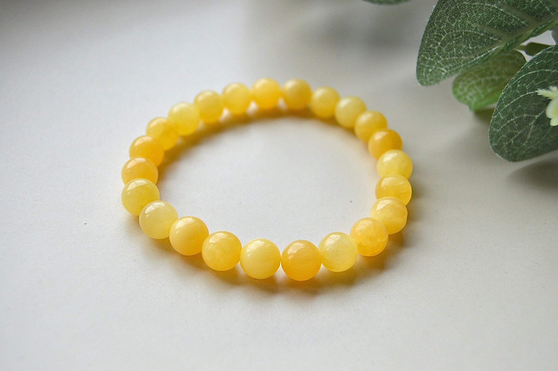 Et vakkert armbånd laget av naturlige kalsittperler, ca. 8 mm i størrelse. Armbåndet har elastisk tråd og passer håndledd på ca. 20 cm.