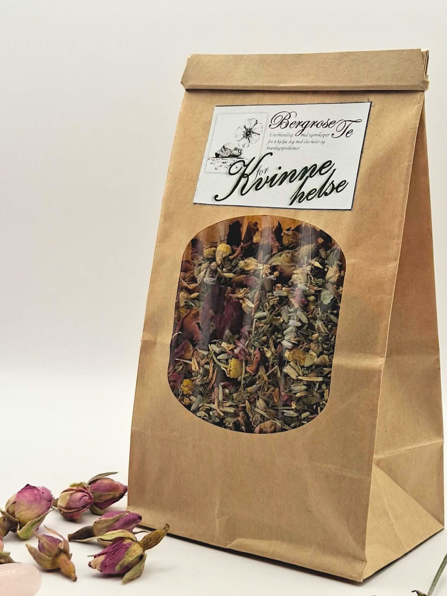 Varm og støttende blanding inspirert av tradisjonelle kvinneurter som bringebærblad, sitronmelisse, rose, lavendel, kamille, rødkløver, brennesle, løvetannblad.