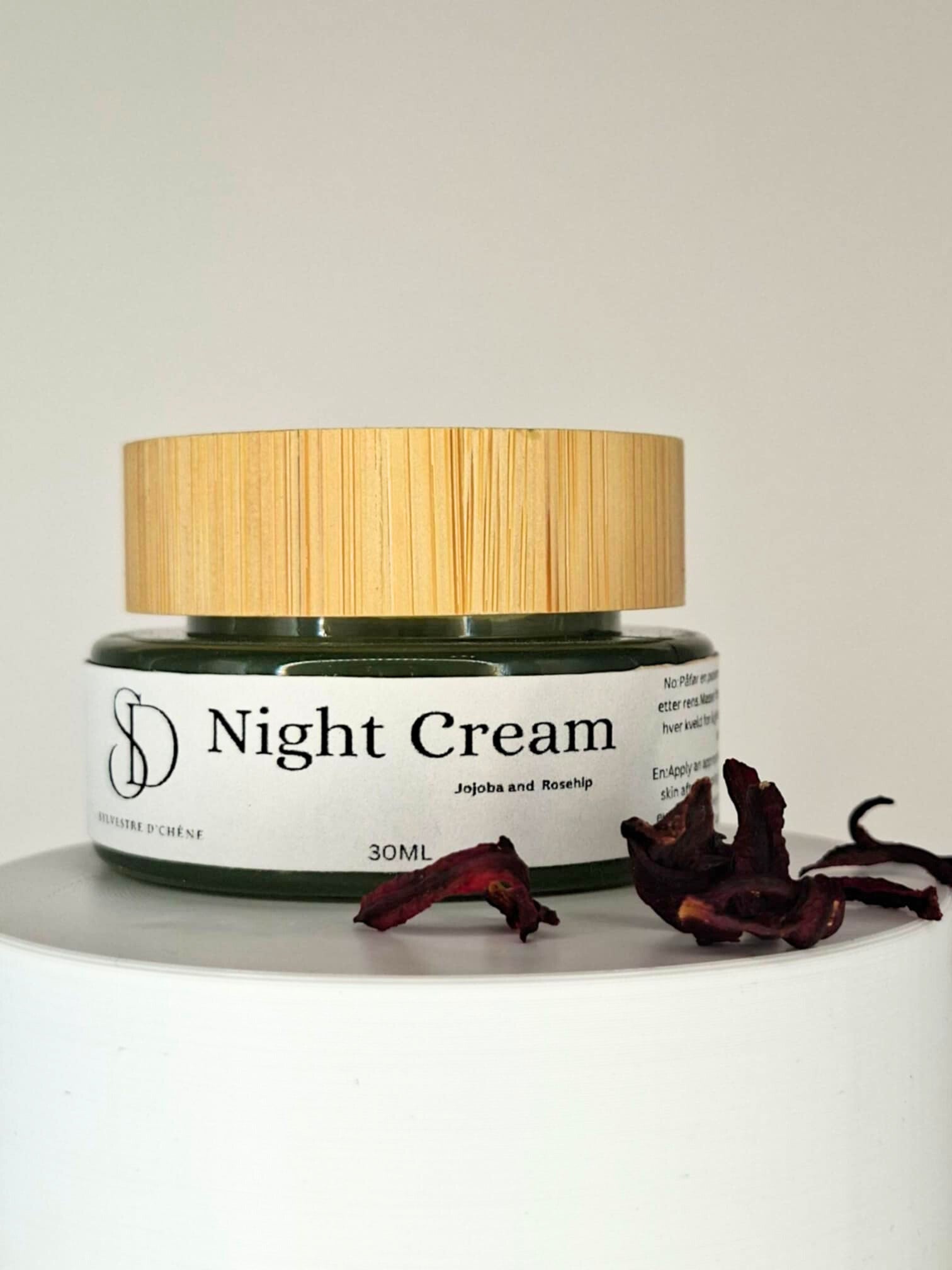 Vår nyutviklede nattkrem er den perfekte starten på dagen for sunn og strålende hud. Den er laget med en nøye utvalgt blanding av naturlige ingredienser som nærer, hydraterer og beskytter huden. Formulert med en lett, men effektiv kombinasjon av jojobaolje, nypeolje, sheasmør og hibiskusolje, gir denne kremen en optimal balanse for huden din.
