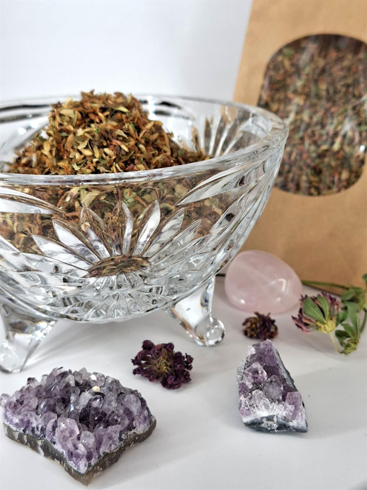 Spirituelt forbindes rødkløver med kjærlighet, harmoni og god energi. Mange bruker den i ritualer eller på alteret som et symbol på lykke, balanse og selvpleie. Den sies å støtte manifestasjon av indre ro og positive intensjoner, og brukes derfor ofte i små ritualer, spell jars eller som røkelsesurter for å skape en myk og energigivende atmosfære.